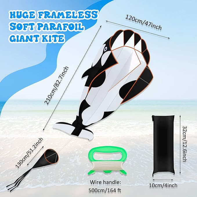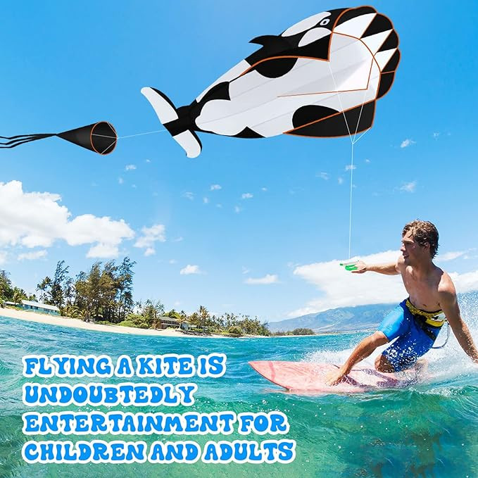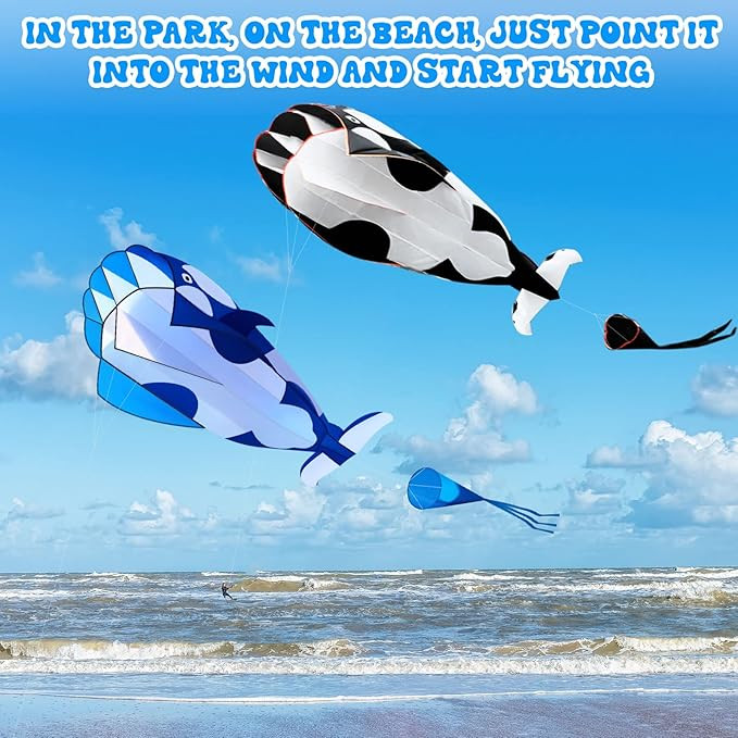 2 chiếc diều bãi biển 3D lớn hình cá voi sát thủ diều khổng lồ có đuôi không khung lớn dễ bay với dây và tay cầm cho người lớn trẻ em trò chơi ngoài trời bãi biển hoạt động, 2 màu