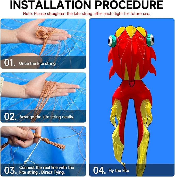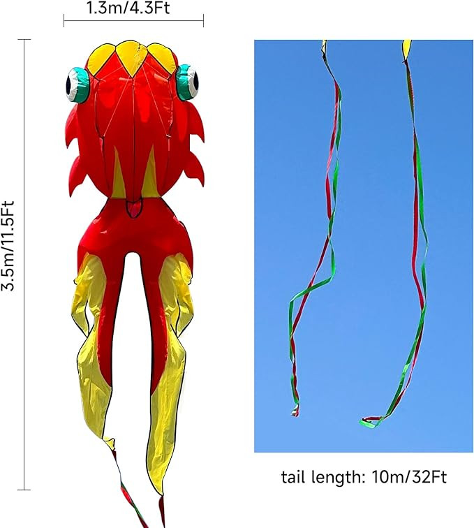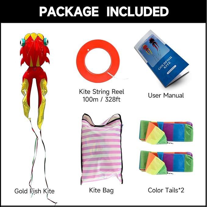 • ?【Nội dung đóng gói】: Diều cá vàng X1, Túi đóng gói X1, Bánh xe tay cầm 328ft X1, Đuôi nhiều màu X2, Sách hướng dẫn sử dụng X1