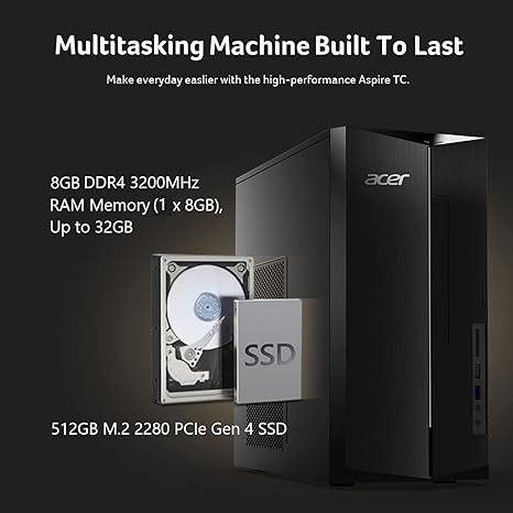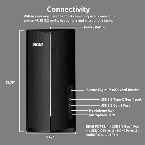 Máy tính để bàn Acer Aspire TC-1780-UA92 | Bộ xử lý Intel Core i5-13400 thế hệ thứ 13 | DDR4 8GB 3200MHz | SSD M.2 512GB | Đầu đọc thẻ SD | Intel Wi-Fi 6E AX211 | Windows 11 Home, Màu đen