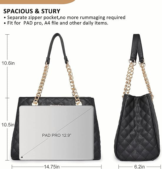 • Túi tote này có họa tiết chần bông và dây đeo vai bằng xích vàng.